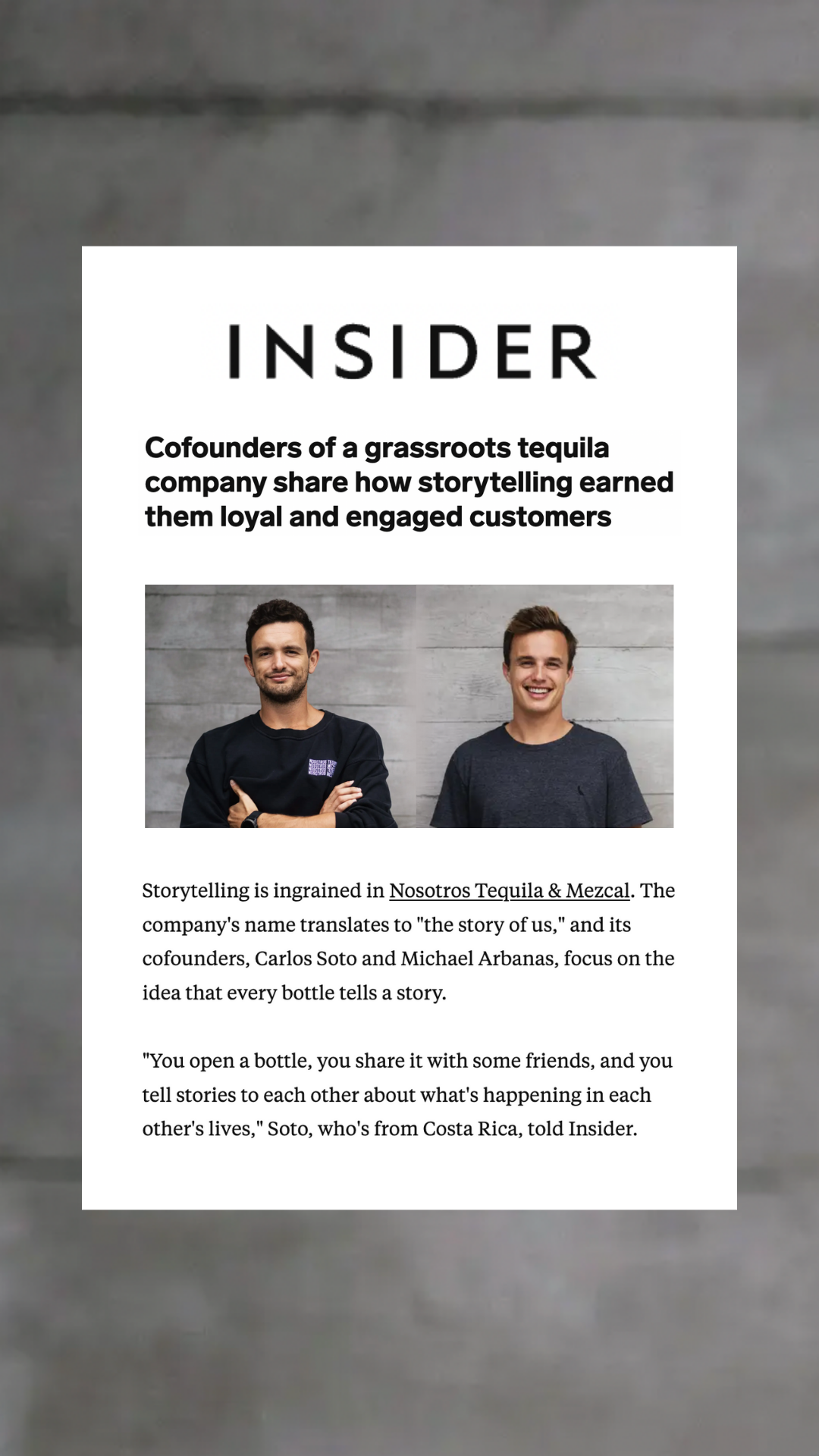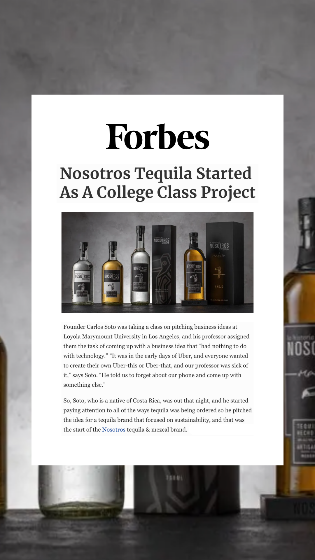Started by Carlos Soto and Michael Arbanas and in the market by 2017, the idea of Nosotros was catalyzed by a college assignment, born from a passion for tequila. Our first expression, an unaged Blanco, put us on the map when it ultimately yielded “Best Tequila” at the world’s most respected spirits competition amongst many of the industry’s well-known brands.