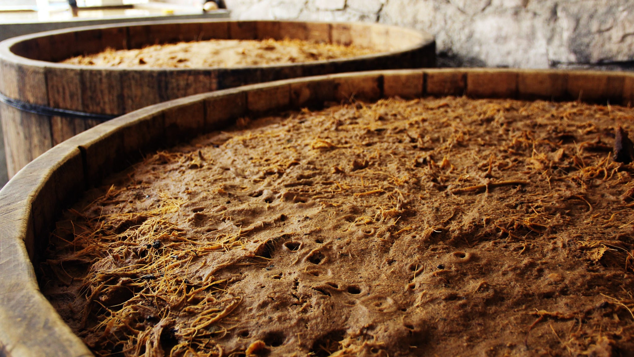 Fermentation happens in pine wood tubs.