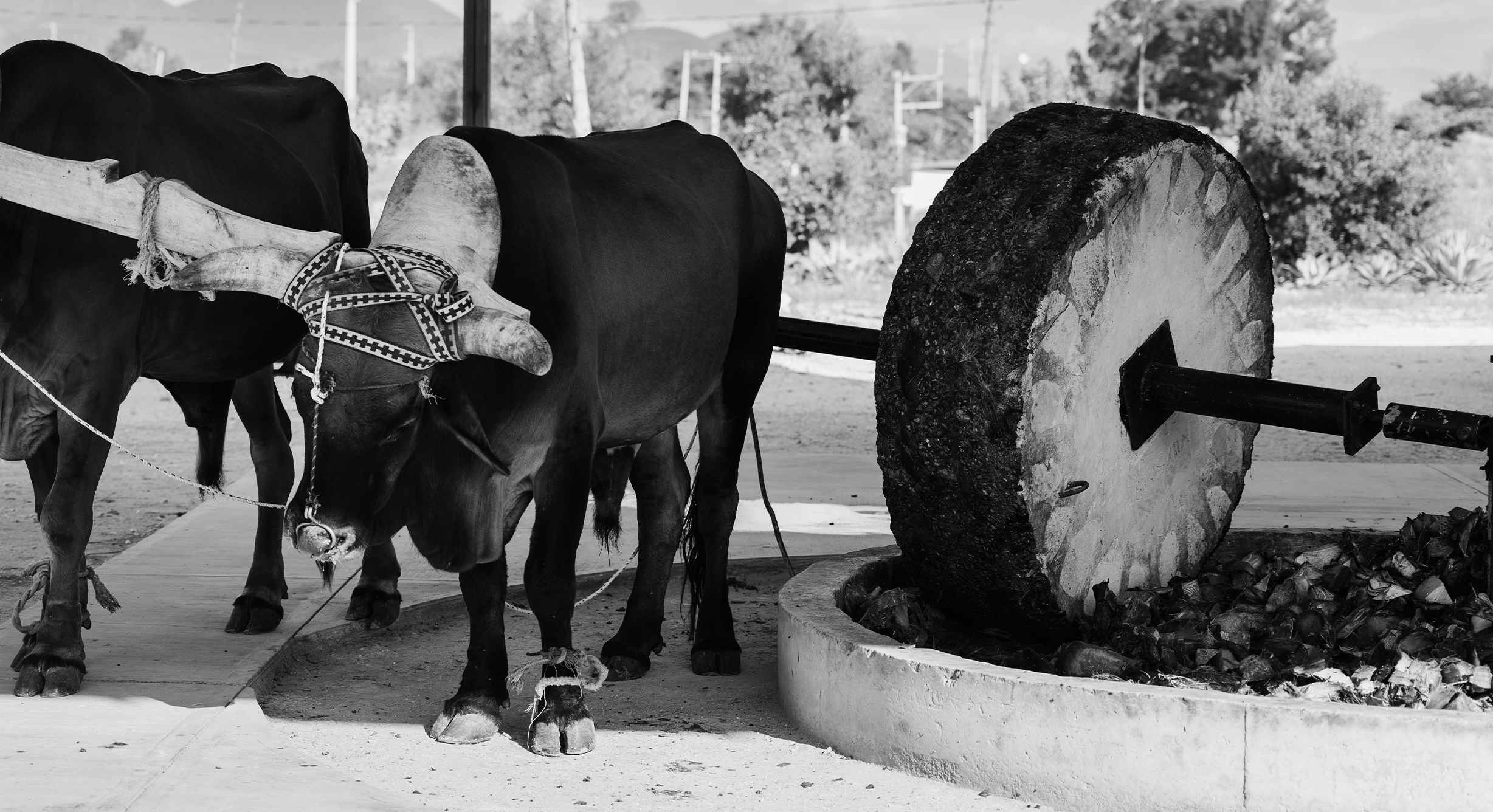 Cooked agave is milled with a traditional Tahona (rock mill).